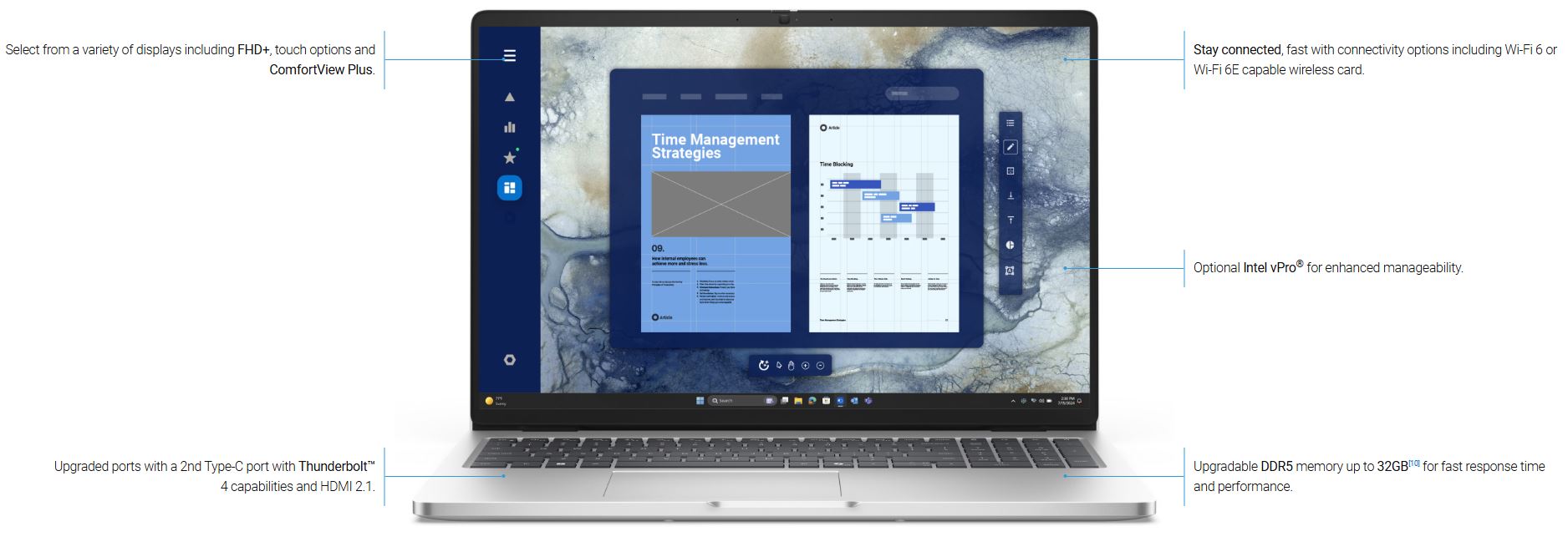Thanks to an expansive 16:10 display with sleek, narrow bezels, Dell Pro 16 has 10% more screen area than the predecessor. This means you can work more productively on a roomier, more detailed screen.